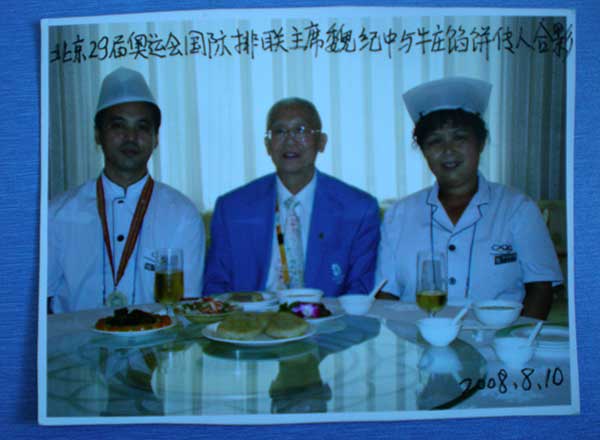 北京29屆奧運(yùn)會(huì)國(guó)際排聯(lián)主席魏繼中與牛莊餡餅傳人合影