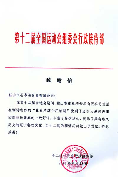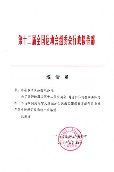 信息動態->第十二屆全國運動會組委會行政接待部---邀請函、致謝信
